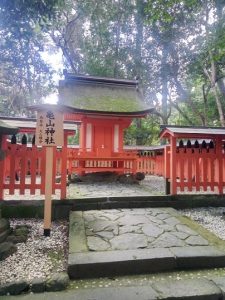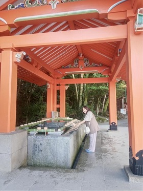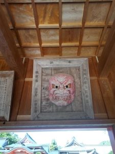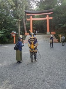 場違いの武士が鎧を来て、神社正面を見つめている。」ときどき矢を神社に向けている。八幡だから必ず「戦う」象徴としてこういう人が出てくる。観光客は「なぜ、そういう姿でお参りするのですか」と聞いていた。